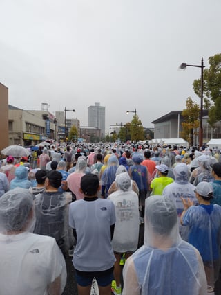 スタート前から雨。晴れの国おかやまなのに雨。みんなカッパを着て寒さに震えながらスタート。